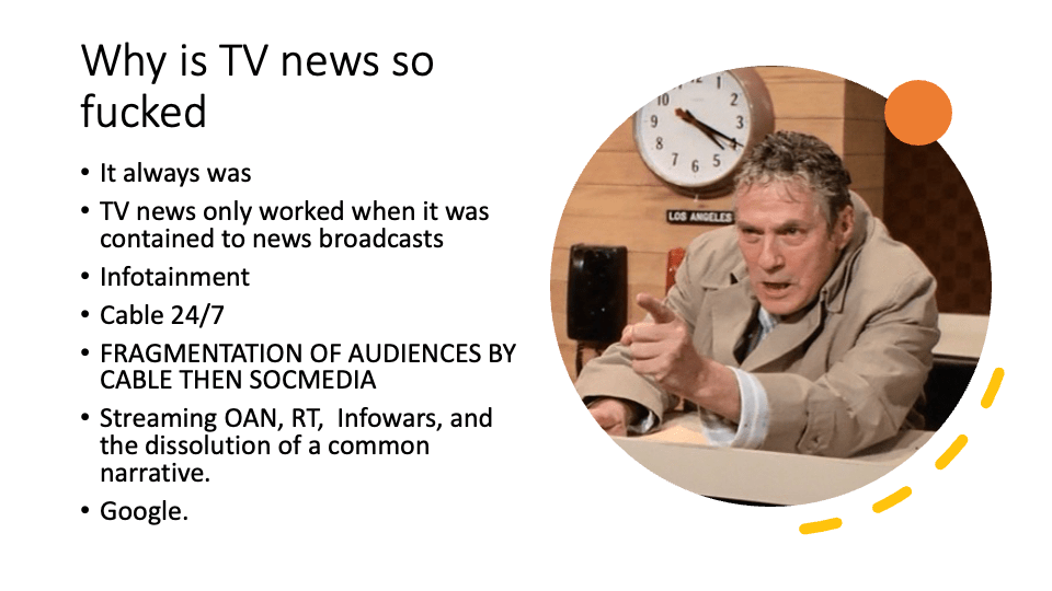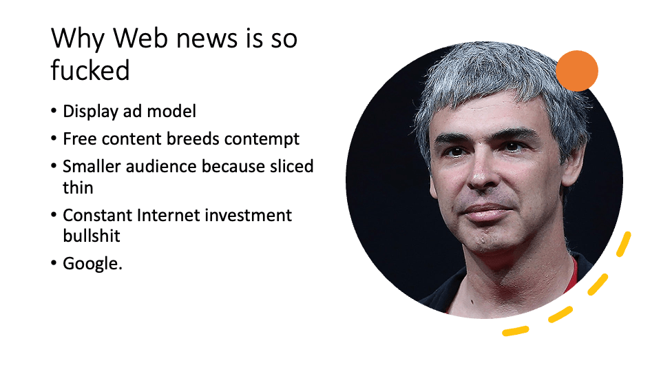 Two years ago, I gave a presentation at a little gathering we like to call ThruntCon entitled “Everything you need to know about the inevitable collapse of journalism as we know it.” For reference, these are the slides I spoke to in that talk: